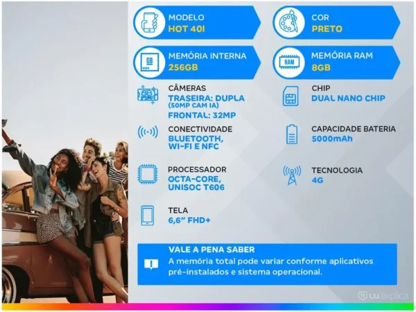 O Hot 40i é ideal para quem usa redes sociais, vídeos, aplicativos, chamadas e precisa de memória de sobra para o cotidiano. É um smartphone que entrega mais do que muitos da mesma faixa.